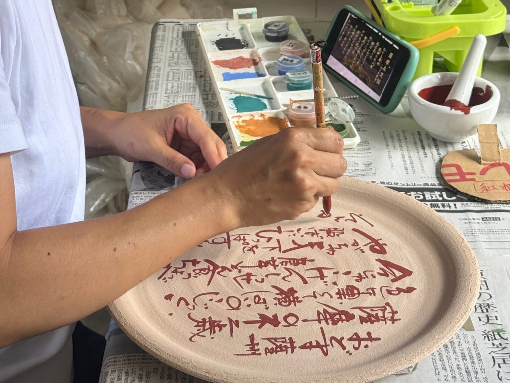 〈つきの虫〉が手がける器に、天文館店のガラス面に桜島を描き、九州国立博物館のマークもデザインした書家・西尾真紀が一枚ずつ筆を入れた特別コラボ。