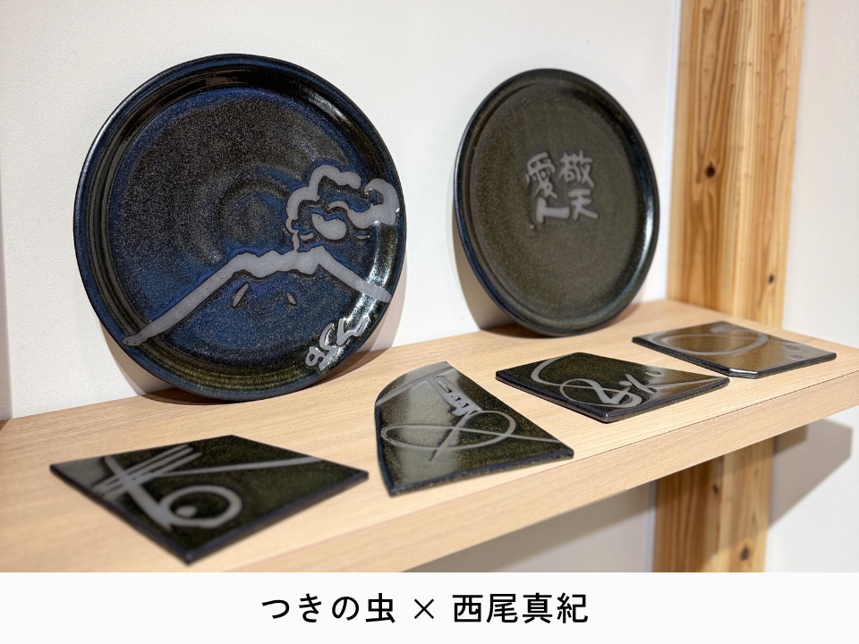 〈つきの虫〉が手がける器に、天文館店のガラス面に桜島を描き、九州国立博物館のマークもデザインした書家・西尾真紀が一枚ずつ筆を入れた特別コラボ。