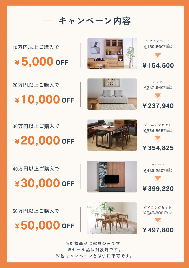 ご購入金額に応じて家具をお安くお買い求めいただけるまとめ得キャンペーン!