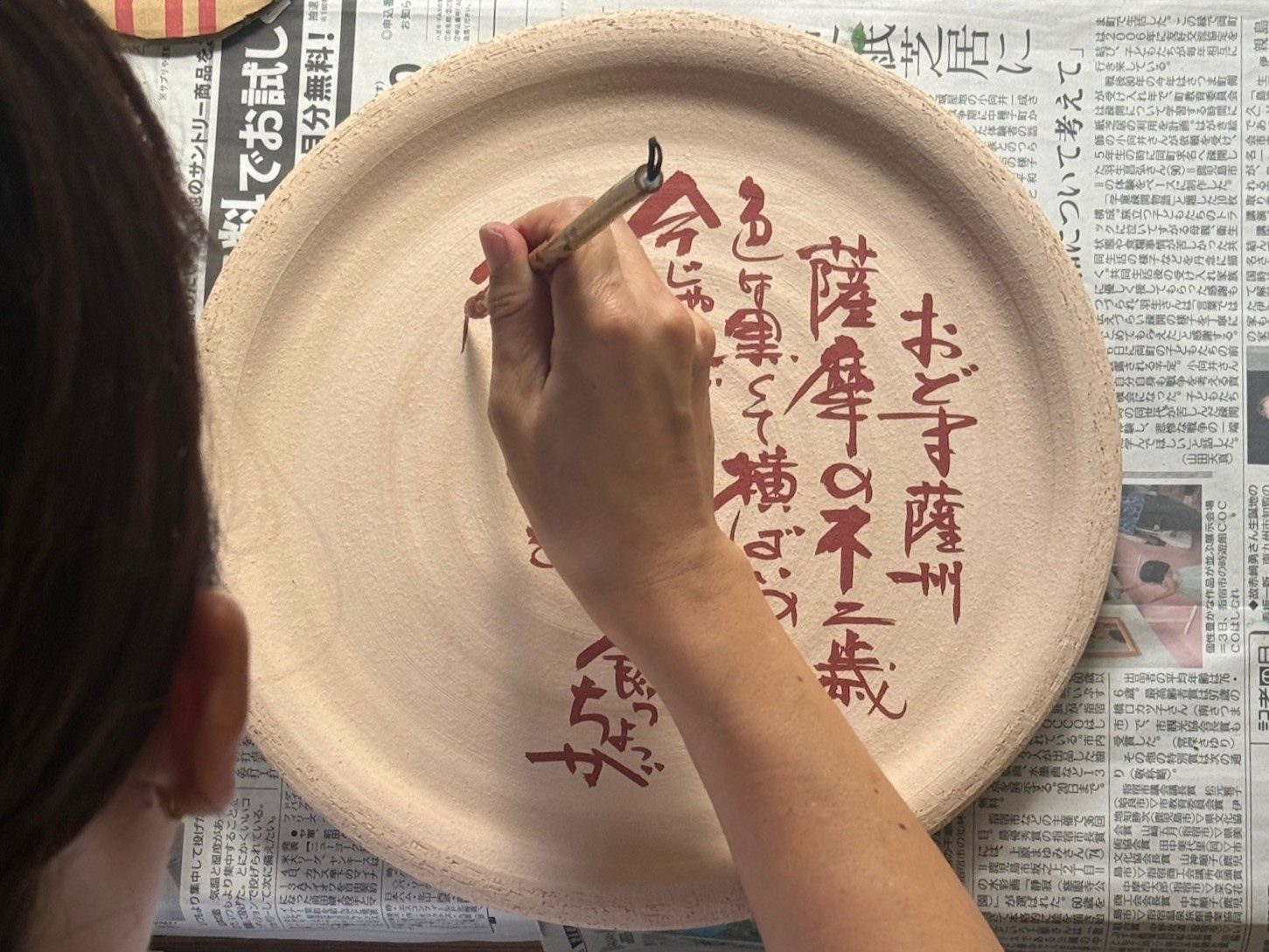 天文館店のガラス面に桜島を描いた書家・西尾真紀が、その場でお好きな文字を書き入れます。