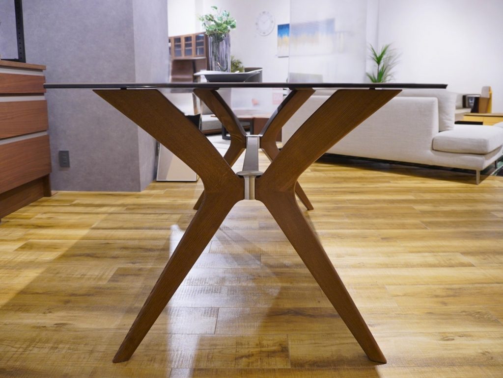 幕板がつかないシンプルな一枚天板の構造は、華奢なクロス脚を際立たせます。