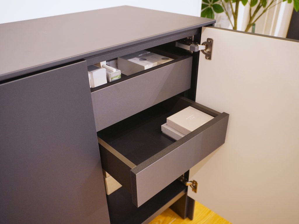 収納部には内引出と可動棚が設けられており、大きなものから細かいものまで効率良く収納できます。