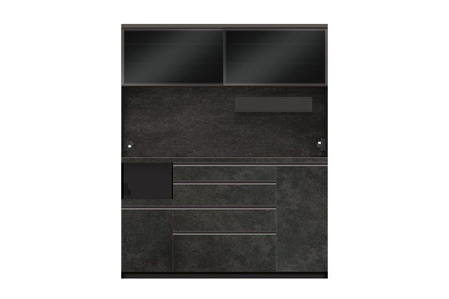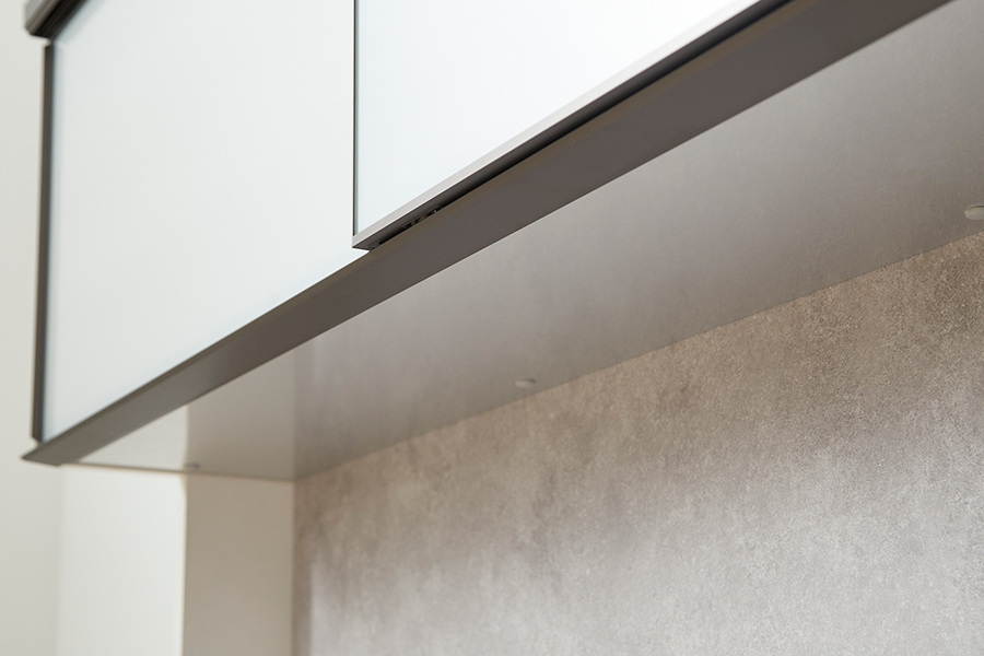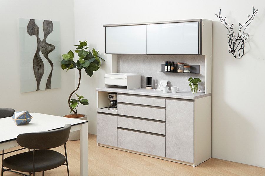 上部には熱や湿度に強いアルミボードを採用しました。調理家電から生じる熱や蒸気から食器棚の腐食を守ってくます。