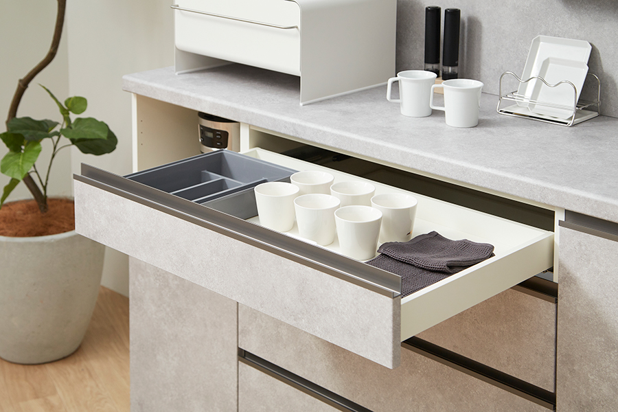 従来の引戸とは異なり、ワイドビュー設計の引戸を採用。扉がフルオープンになるためすべての食器が見やすく、出し入れも簡単に行えます。中の棚板は高さ調整が可能です。
