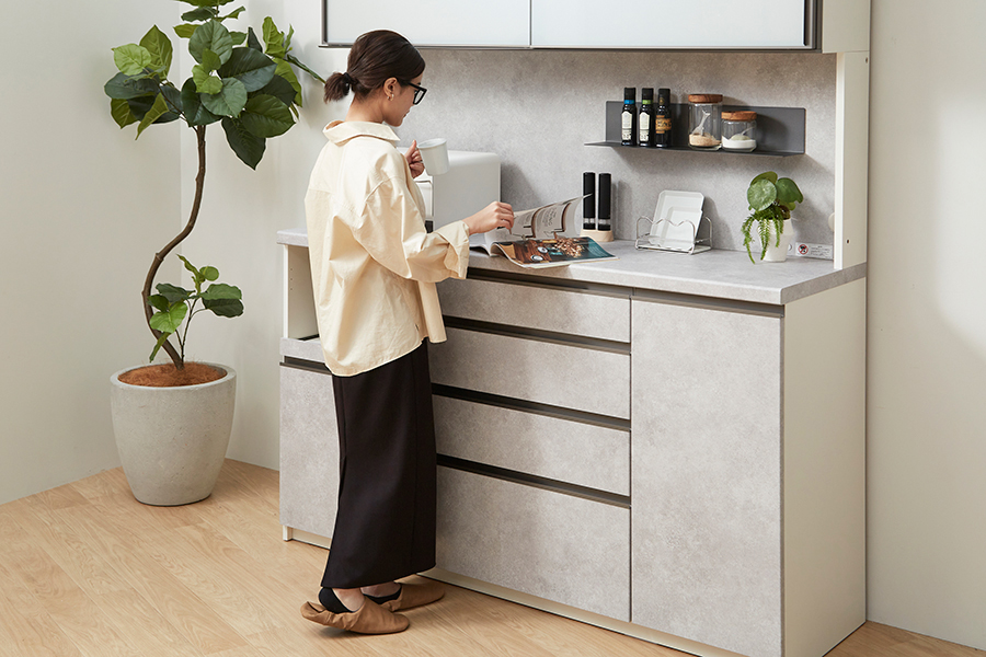 ハイカウンター(H94cm)のため立ったままでの作業がしやすく快適です。更に引き出しが4杯になることで収納力もアップしました。