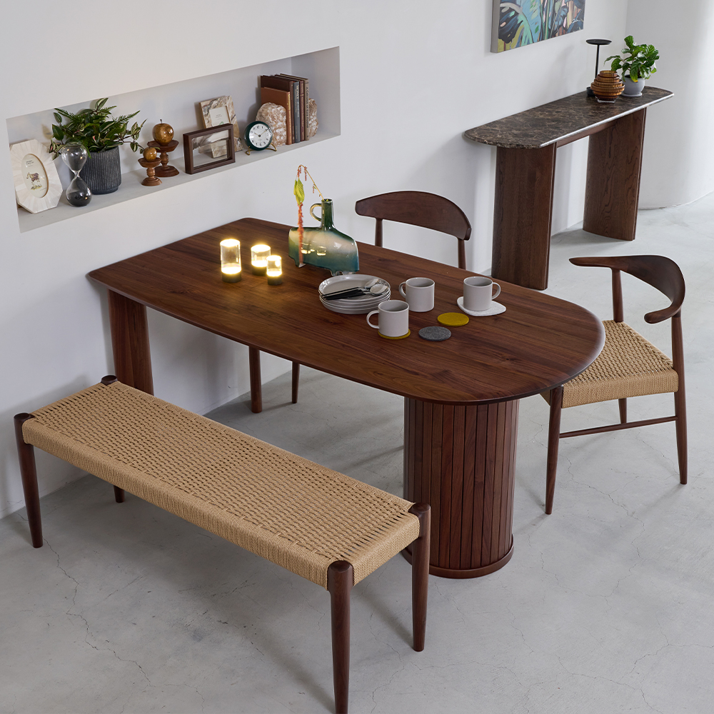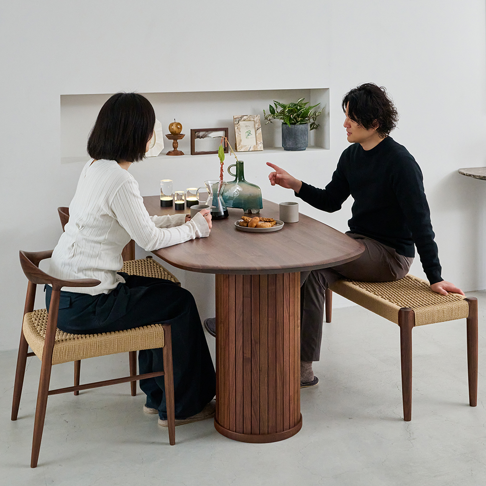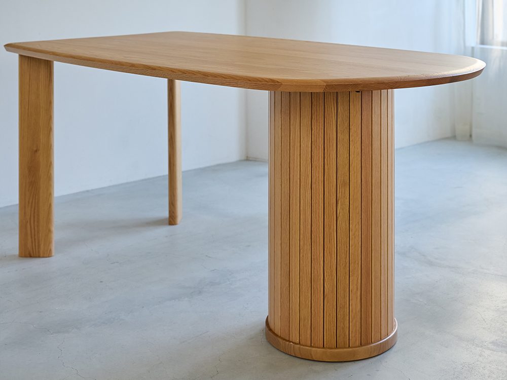 空間の中心に確かな安定感を生む太めのシリンダー脚と、寄り添うように配された楕円脚2本。