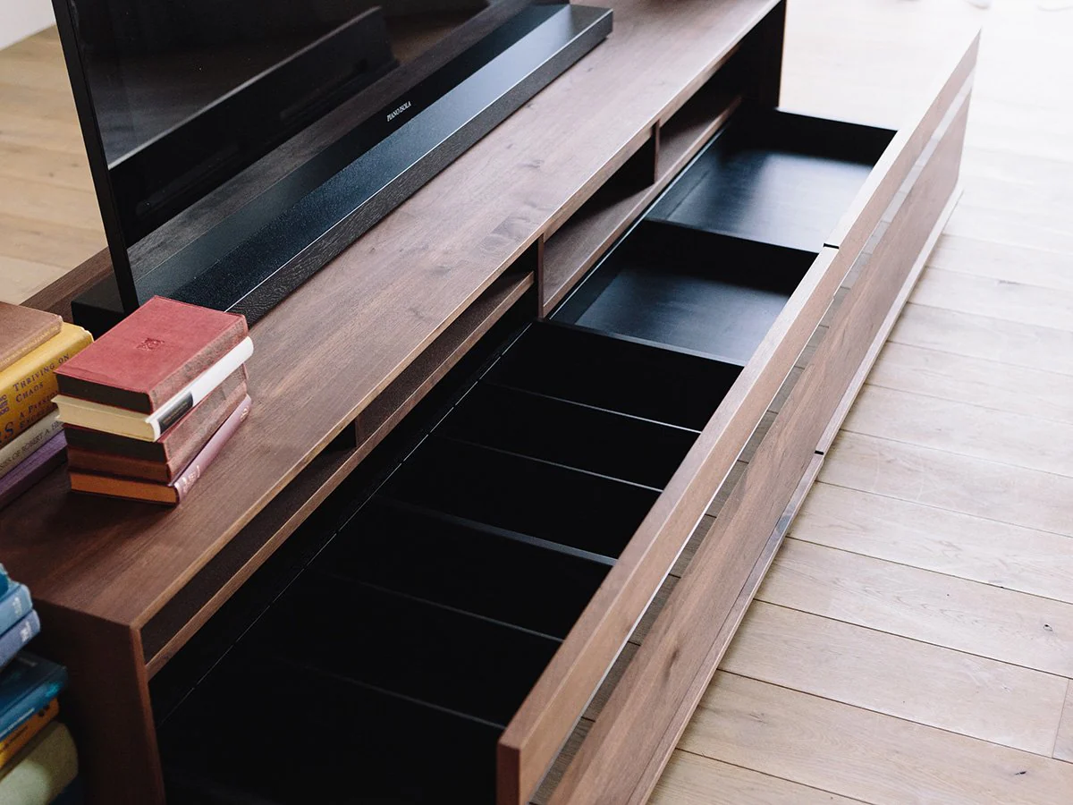機能が意匠を創り出す、ガラスのスリットが印象的なLIBERIA PLUSのテレビボード。