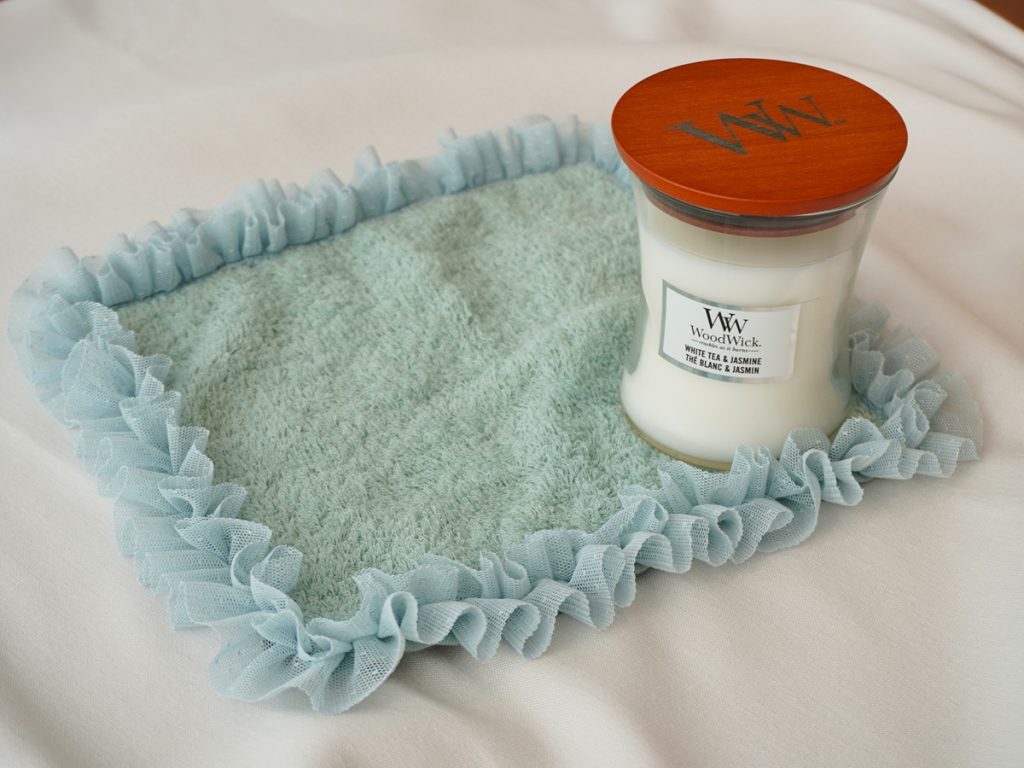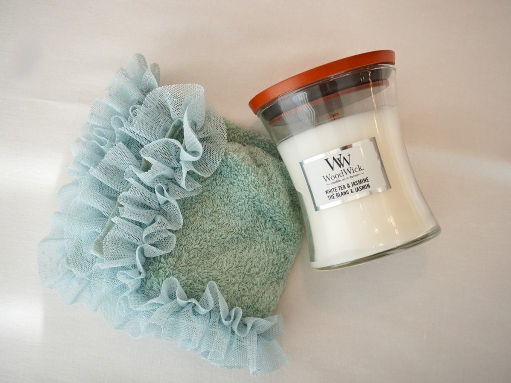 暖炉のようにパチパチと音がなるキャンドル「WoodWick」と、やわらかな風合いにフリルをあしらった「Hug O War」のハンドタオル。